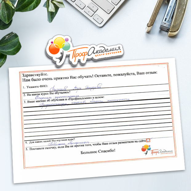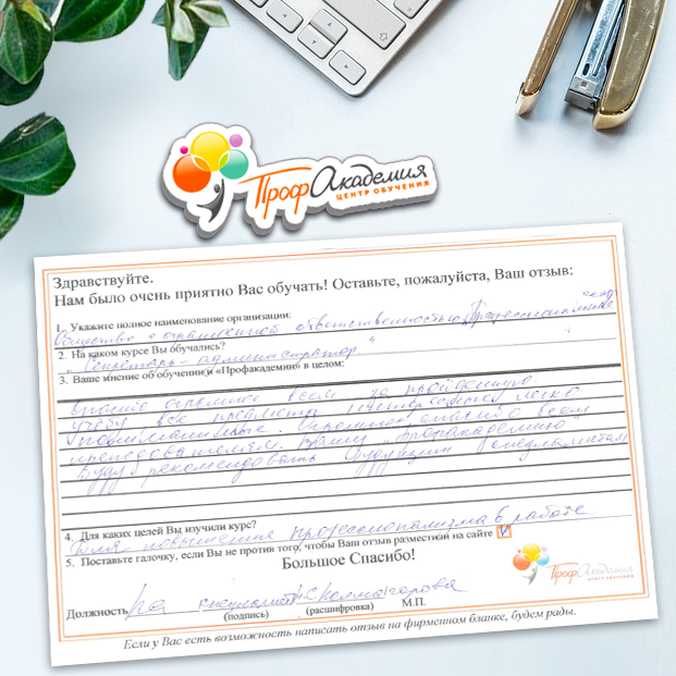 Здравствуйте! Огромное спасибо за предоставленные курсы обучения на администратора. Все очень доступно и понятно. Курсы администратора - новое направление в моей деятельности и для меня очень важно было четкое последовательное изложение материала. Благодарю за проведенное обучение и желаю успехов в профессиональной деятельности.