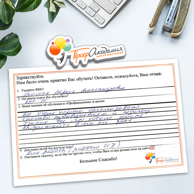 У всех педагогов нашей школы только положительные впечатления от обучения в "Профакадемии" Учебный материал очень интересный. Есть и презентации, и видеоматериалы. Все воспринимается легко и доступно. Все подтемы разложены по полочка, очень удобно для изучения! Очень вам благодарны, планируем и дальнейшее обучения в вашей Академиии.